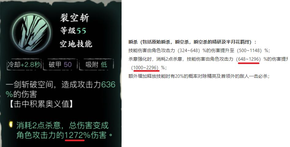 首先可以看到原始数据瞬杀和裂空倍率是大致相当,满级瞬杀倍率是1296,满级裂空是1272 且两个技能都是通用技能。由此我们可以理解为官方是将两个技能对标的。