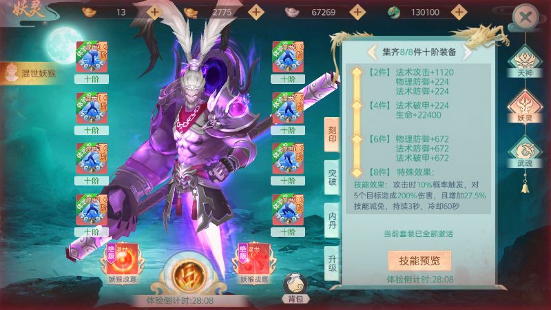 大圣专属技能:定海神针攻击时10%概率触发,对5个目标造成200%伤害,且增加5%技能减免,持续3秒,冷却60秒