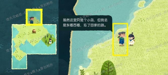 💎8、完成剧情触发,需要寻找住在森林里的一家后,就先把所有地图拼好在一起,前往小男孩所在位置,边上粉框两只海鸟跑过的时候会飞走,留下两个地图碎片。拿上碎片,是森林相关的区块。