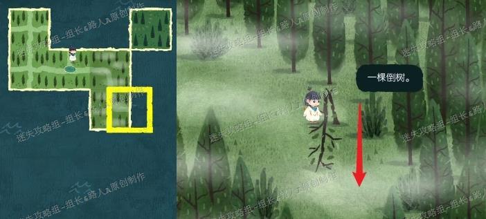 💎27、第二个阶段是依照地上的枯树进行行走方向判断。老样子先放上,走上去后看见下图的枯树,倒下的方向就是该走的方向,另一个区块就放到那个方向。