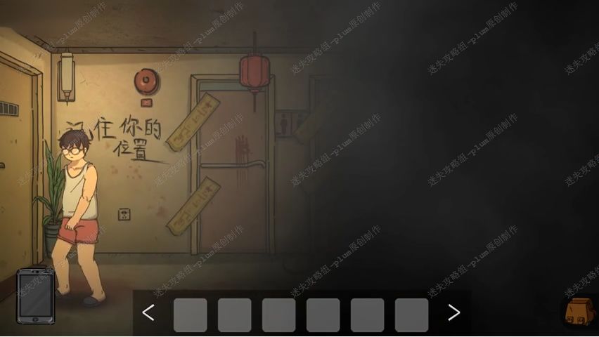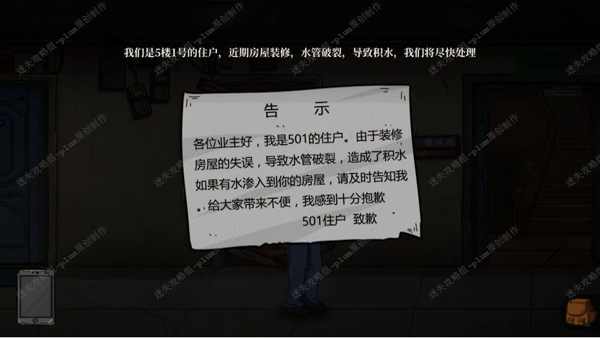 🔹6. 出门后发现主角住在001,旁边002的房间被封上了,墙上的纸条显示“住户501在漏水”,往右走看到有一把铲子在墙边但是现在拿不到。