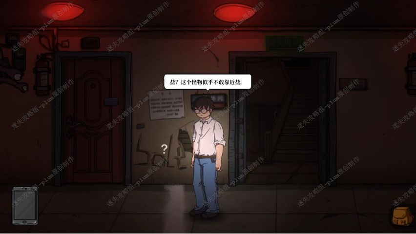🔹1. 回家后门打不开,到达401后发现名为“业”的怪物被一道白线拦住了,墙上有“salt(盐)”并出现怪物怕盐的提示。