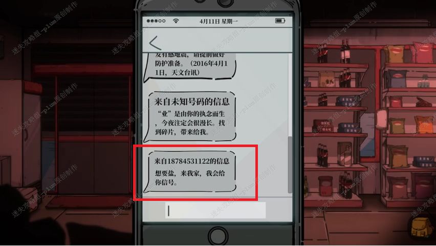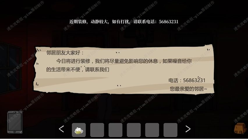 🔹2. 墙上纸条显示楼上装修以及业主电话,拨打业主电话,被挂断后出现手机信息提示“到街上来,红色的光会带给你想要的东西”。