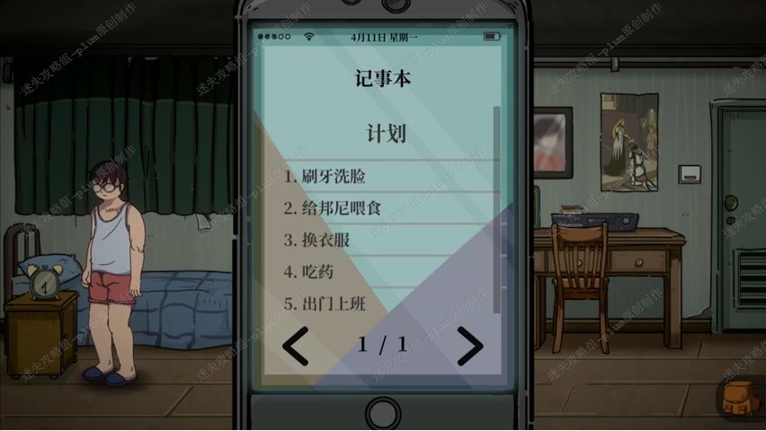 🔹5. 走到衣柜旁边,出现根据日期穿衣的提示,手机显示今天是周一,选择穿白色衬衣。然后吃药出门。
