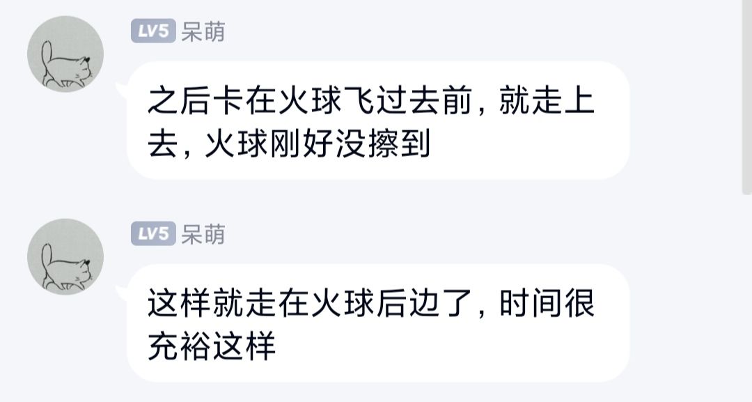 第二段攻略:很多人正常都会等火球过了再跟上去,但是这样是过不去的。方法是在火球放出来之前一小段时间就开始走,一开始会贴着火球,但是这时候不会受伤,然后正常过去就好了。这里容易失误多次,多尝试尝试就好,不放心的玩家也可以凑一套移速装去尝试,详情请看下面视频,感谢一群呆萌大佬的攻略。