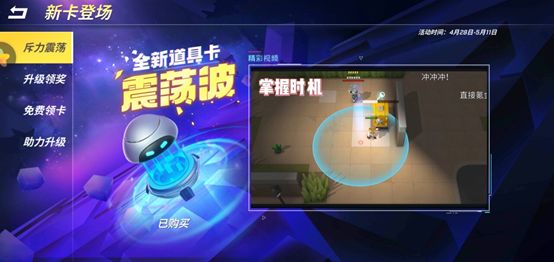 新道具“震荡波”它是一张非常有趣的道具卡~震荡波释放后,在目标区域形成圆形冲击波,将所有玩家(敌我双方)击退一段距离。注意哟!每位玩家释放“震荡波”时,初次释放,将在目标区域放置震荡装置,再次释放,震荡波才会生效,也就是说,连按两次,才是震荡波完整的释放流程~