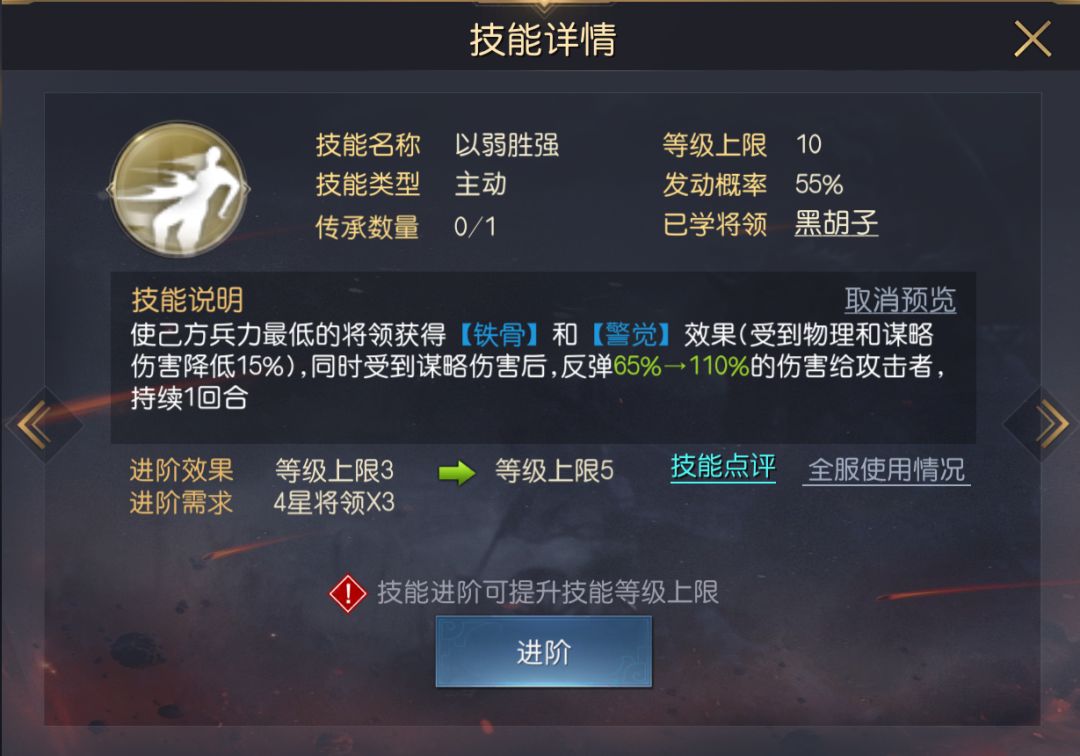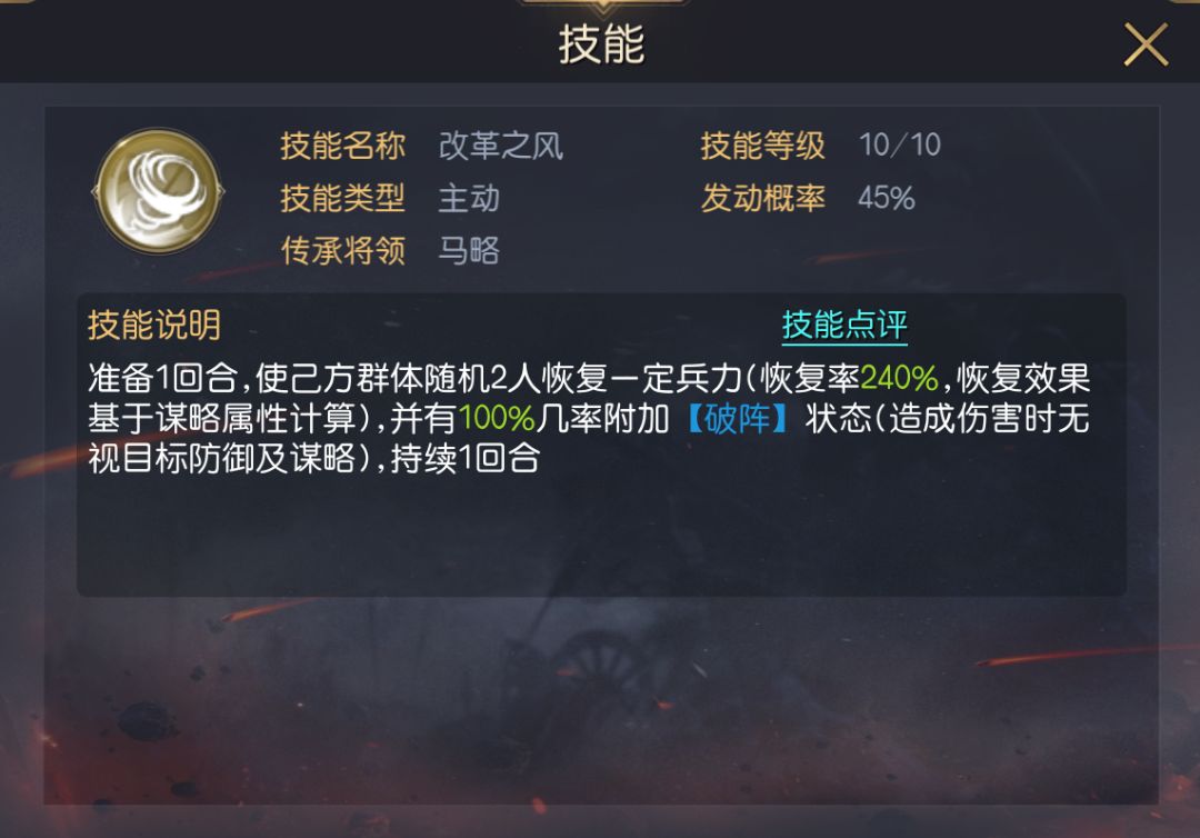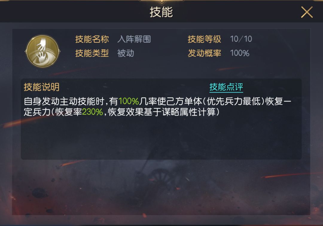 兰陵王的自带技能为运筹帷幄,这是一个被动型治疗技能,虽然技能本身无主动恢复能力,但可在他每次成功发动主动技能后,必定为兵力最低的己方单体恢复兵力,利用该效果,搭配上2个主动技能,相当于兰陵王拥有了2个主动技能+2个单体恢复类技能,让他在搭配技能时有更多空间去学习输出型、功能型技能。