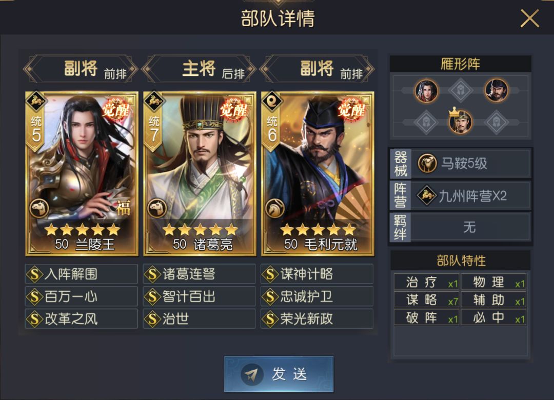 该阵容主打单核输出,依靠诸葛亮个人爆发能力,配合毛利元就的奇谋加成,有极高的概率在短期内结束战斗,即使战线被拉长,也能通过兰陵王的高额治疗保证战损。
