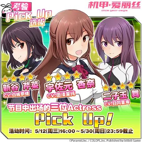 活动说明:活动期间,「★4宇佐元 杏奈」、「★4新谷 芹菜」、「★4二子玉 舞」选拔概率提升,占★4 Actress概率的66.7%。