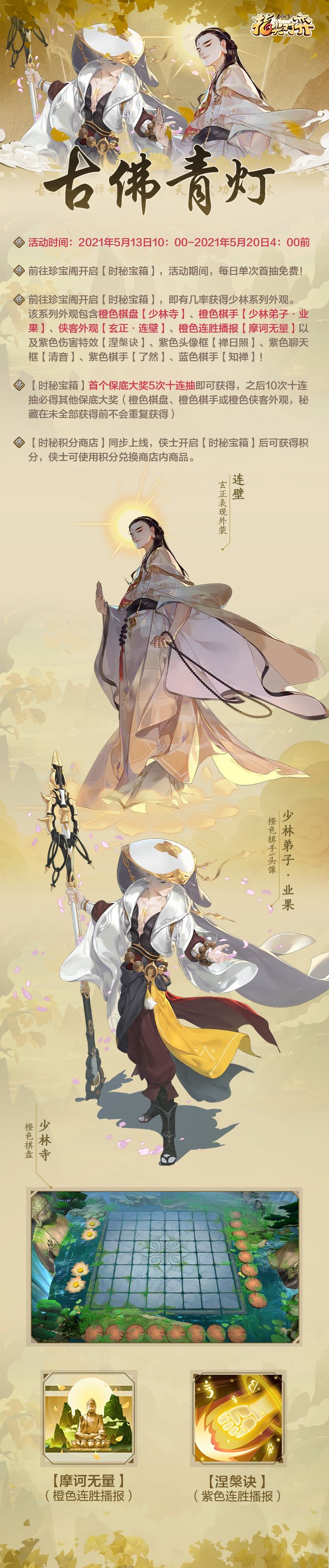 ★【古佛青灯】时秘宝箱限时开启时间:5月13日10:00-5月20日4:00 ,活动开启后前往“珍宝阁”选择“时秘宝箱”即可获取!