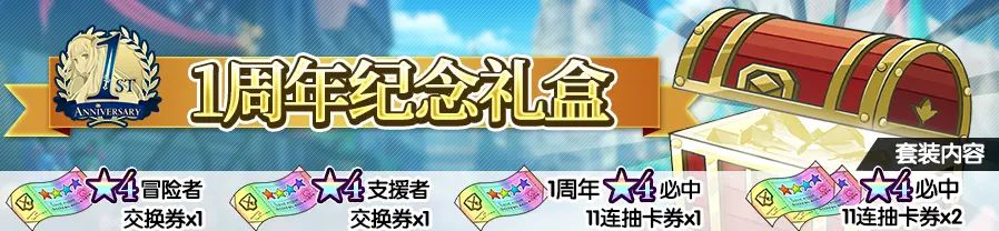 ★4冒险者交换券*1、★4支援者交换券*1、1周年★4必中11连抽卡券*1、★4必中11连抽卡券*2