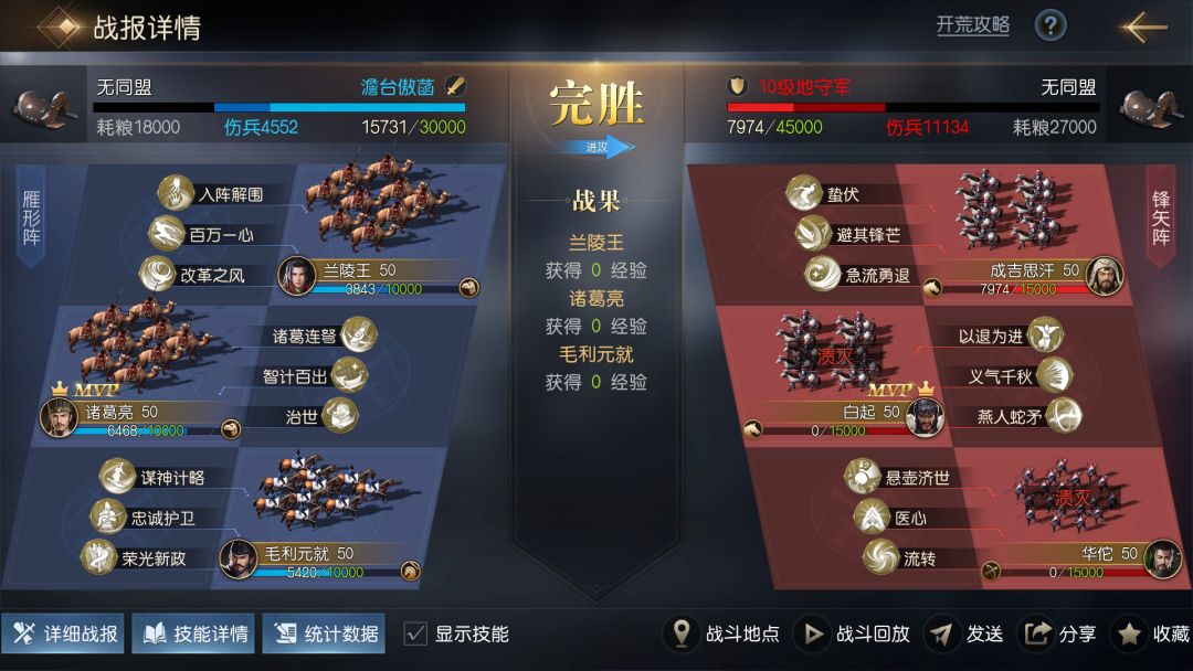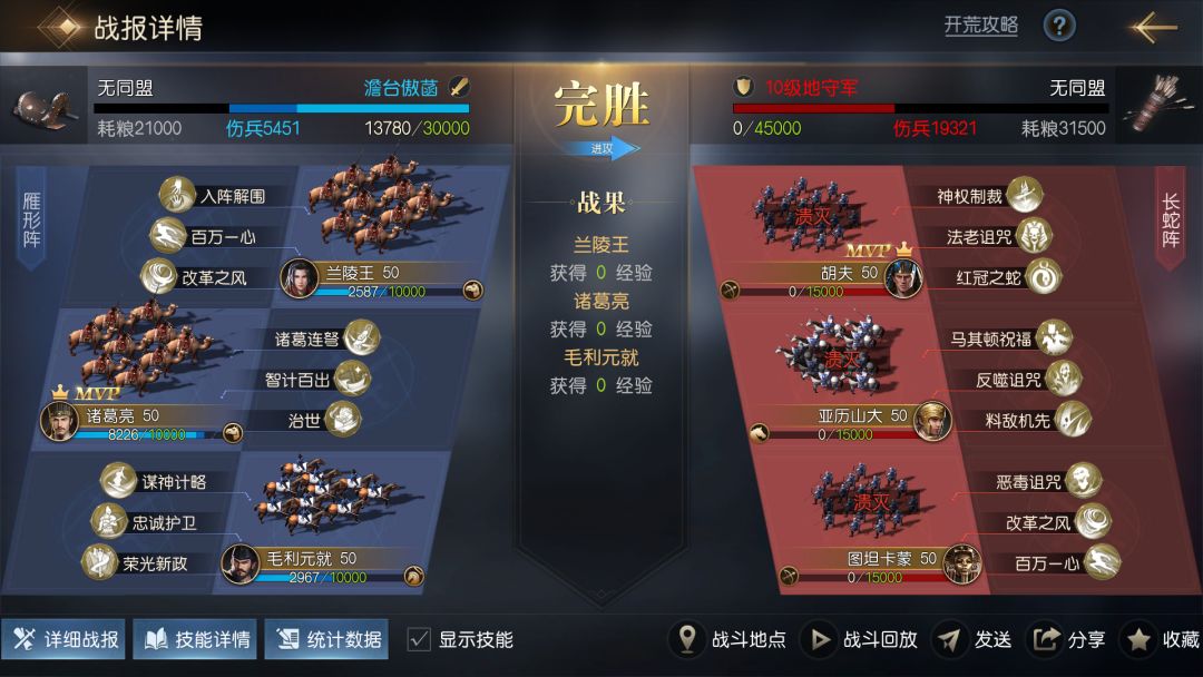 通过实战可以看出,虽然面对兵力超额的10级野地,诸葛亮无法依靠自带技能快速解决某个将领,但通过配合治世的伤害,能保证他全程都拥有稳定输出,只要触发奇谋并发动诸葛连弩,就可迅速压低敌方兵力,在面对后发队、状态队时都有较好表现。