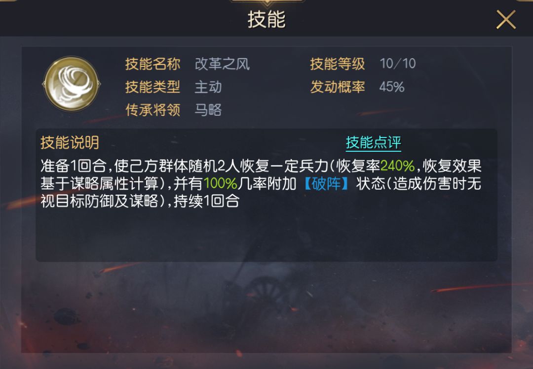 三技能推荐改革之风,虽然该技能需要准备回合,不利于他自带技能的发挥,但可提供高额群体恢复,并为其施加破阵,既加强恢复效果也提升了诸葛亮的输出效率。
