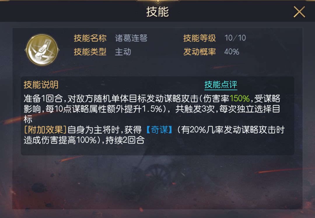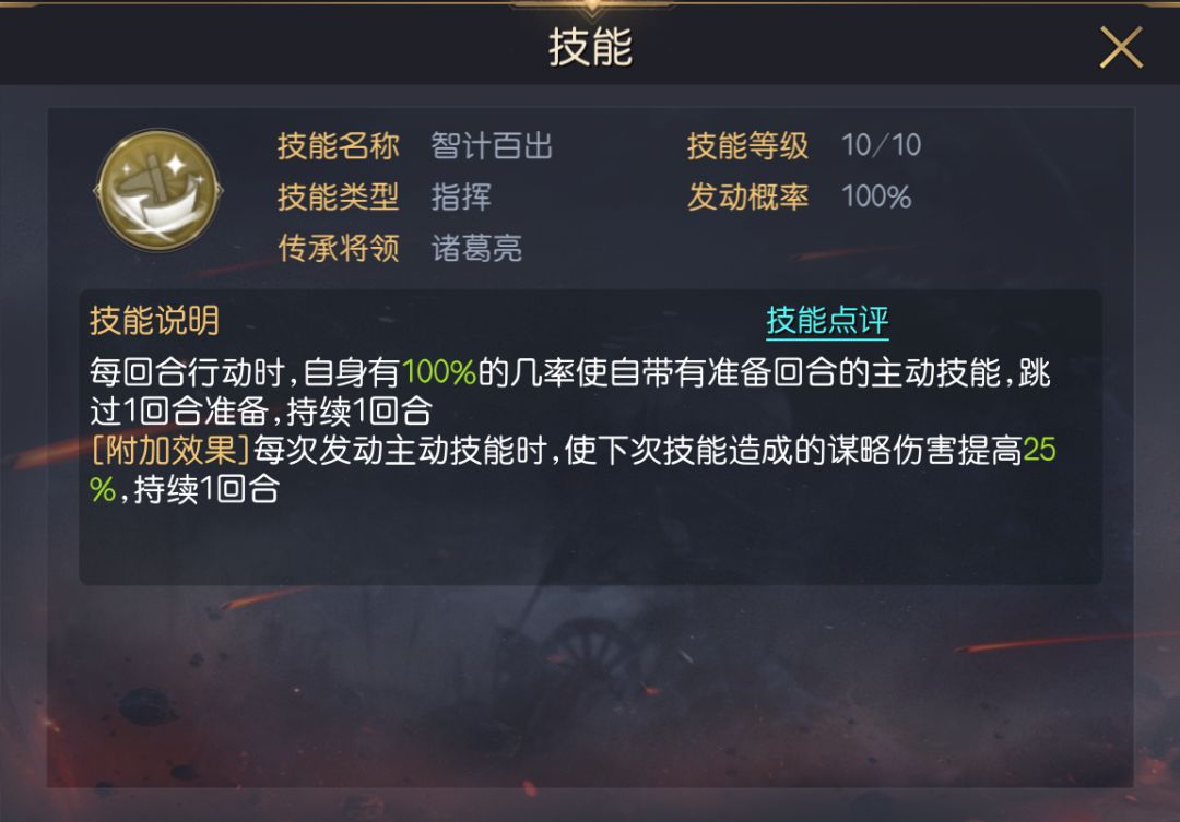 二技能推荐智计百出,诸葛亮自带技能具备准备回合,同时输出比较分散,即使有奇谋加成也无法快速造成有效伤害,智计百出的跳准备效果和谋略加成效果能显著提升他的技能发动效率和技能伤害。