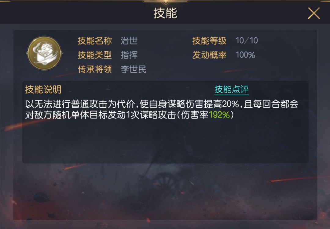 三技能推荐治世,该技能会提升诸葛亮所有谋略伤害,同时每回合必定发动1次单体谋略攻击,提供稳定输出。