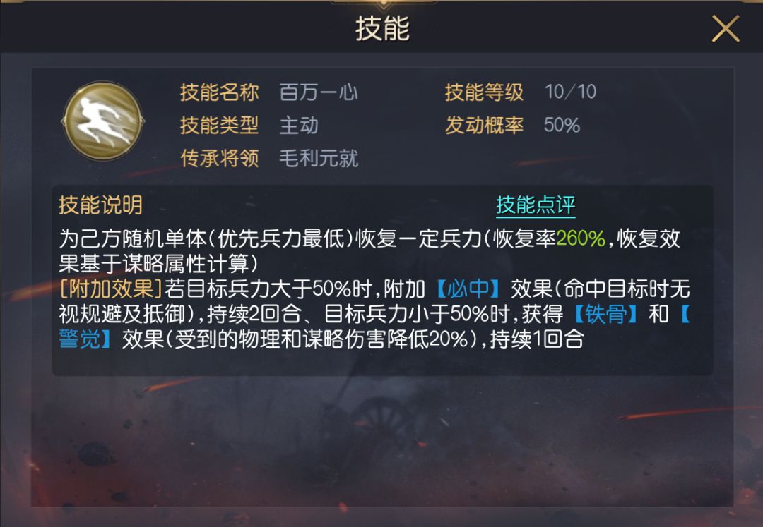 二技能推荐百万一心,配合其自带技能的效果,每次发动百万一心都能以490%的恢复率为兵力最低者提供治疗,再加上附加的增益效果,能极大的保证将领存活。