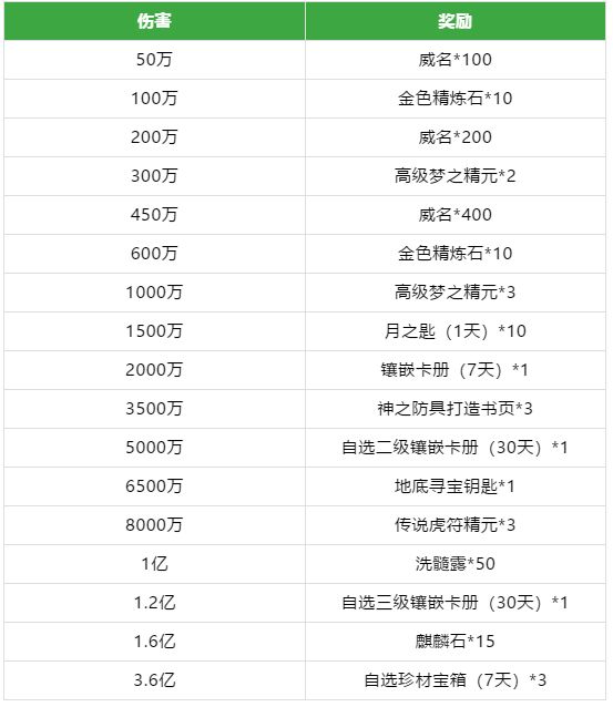 伤害达到3.6亿时更是可以获得自选珍材宝箱3个,里面的天地人翅膀材料都是非常珍惜的哦。