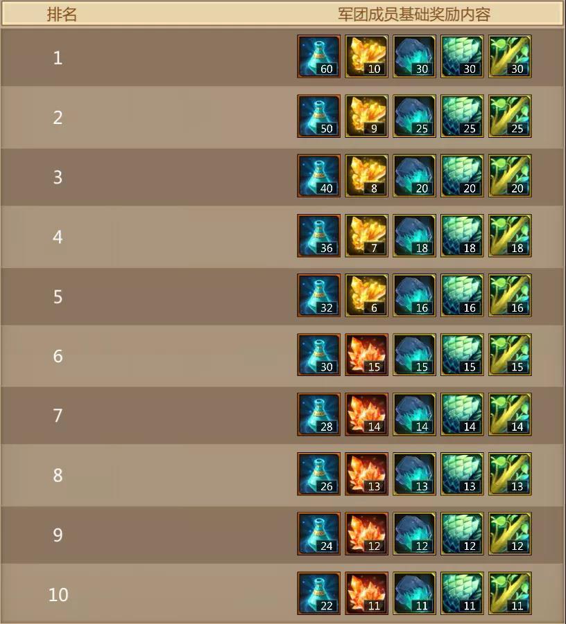 注:根据各个排名的军团内成员的奖励为:排行1-10名可获得3倍基础奖励,11名-20名可获得2倍基础奖励,21名及之后可获得1倍基础奖励。