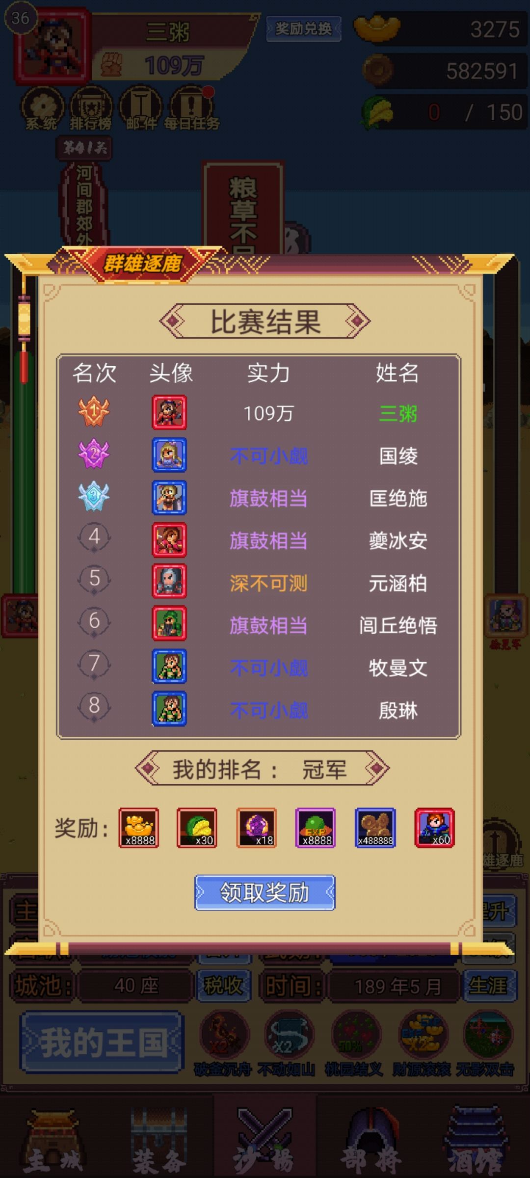 第2天: 109万战力拿了群雄逐鹿冠军,领到8888的元宝真香,随机碎片给了60曹操,正好是阵容需要的,真香!!!