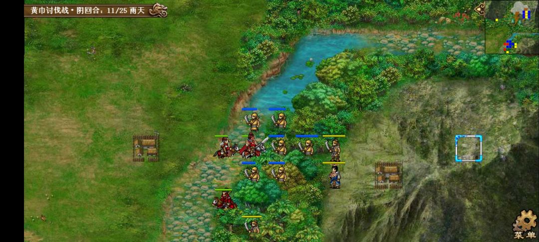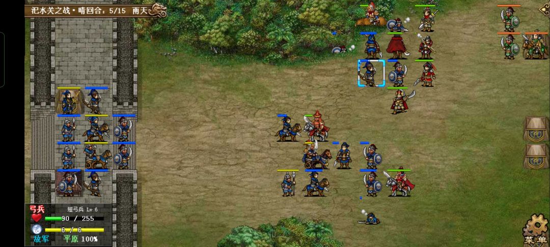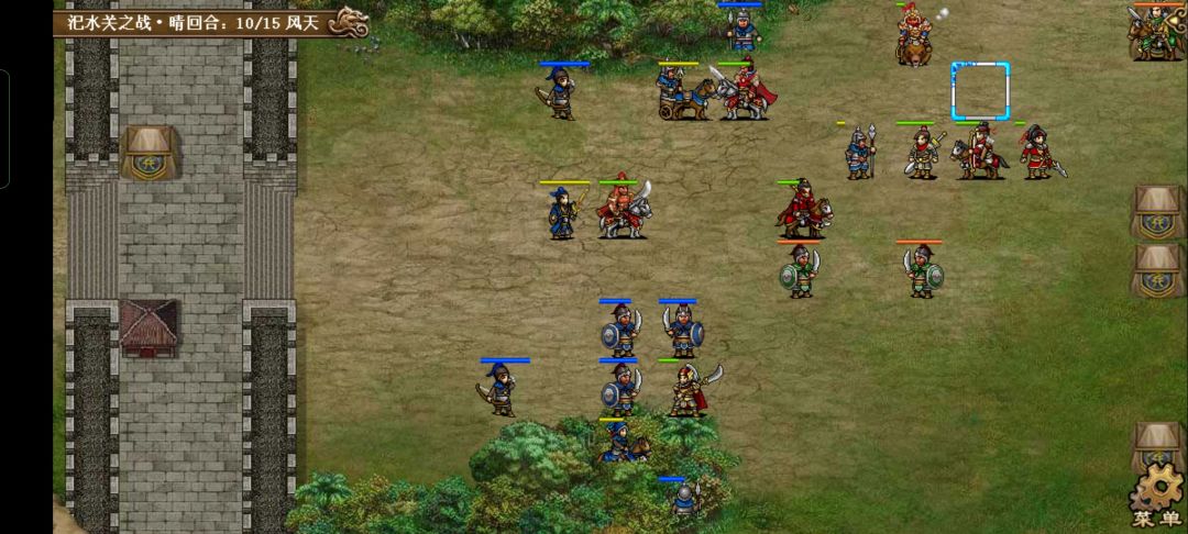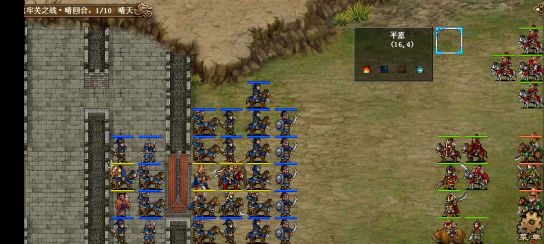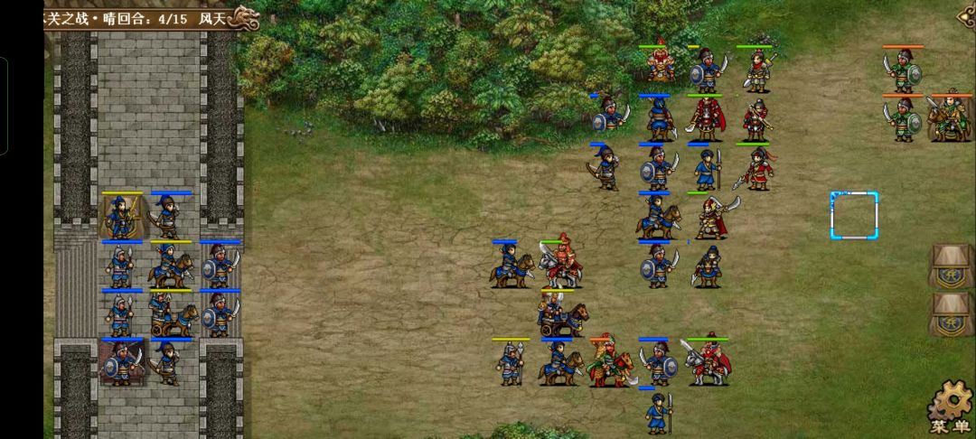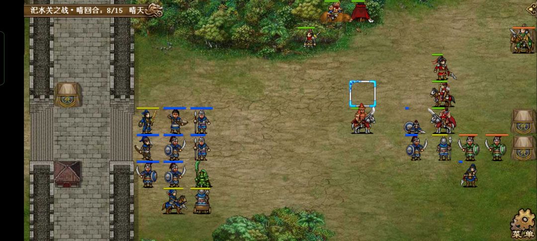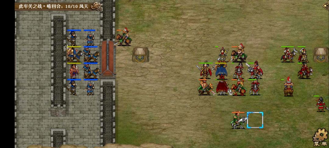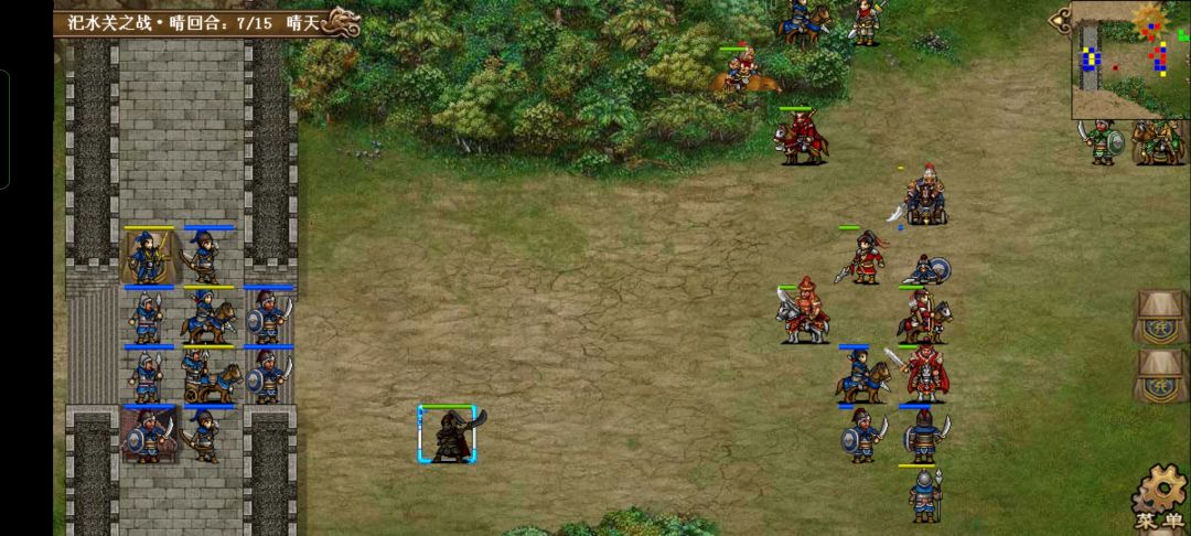 第三回合:由于我这个存档的问题,黄盖发生了一个格挡,导致郭汜没有攻击曹仁,这是巨大的失误,不过这里由于已经有5个经验果容错,所以不选择重新sl,下路弓箭手的位置可以吸引关羽到如下位置,为关羽与华雄的大战埋下伏笔