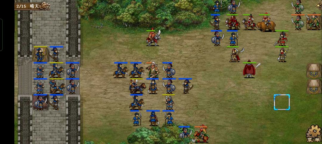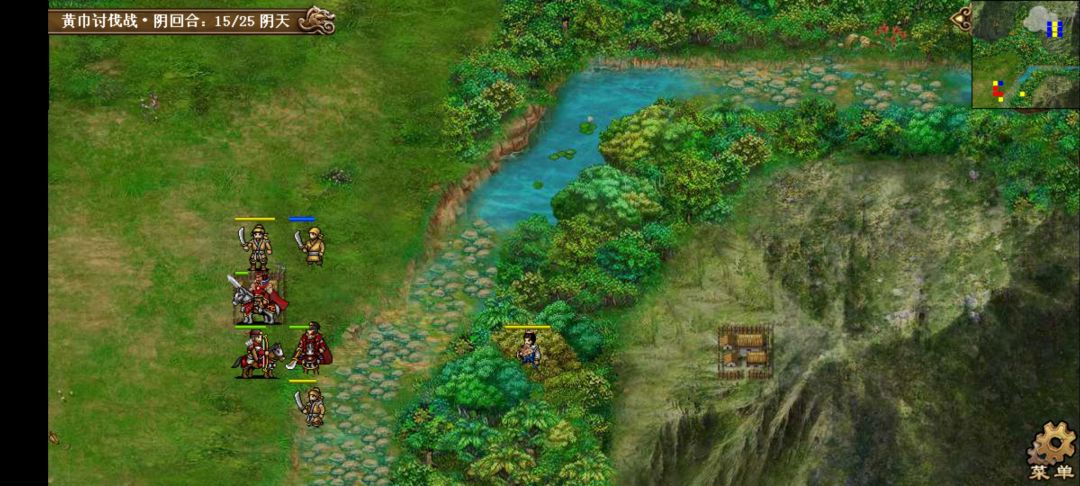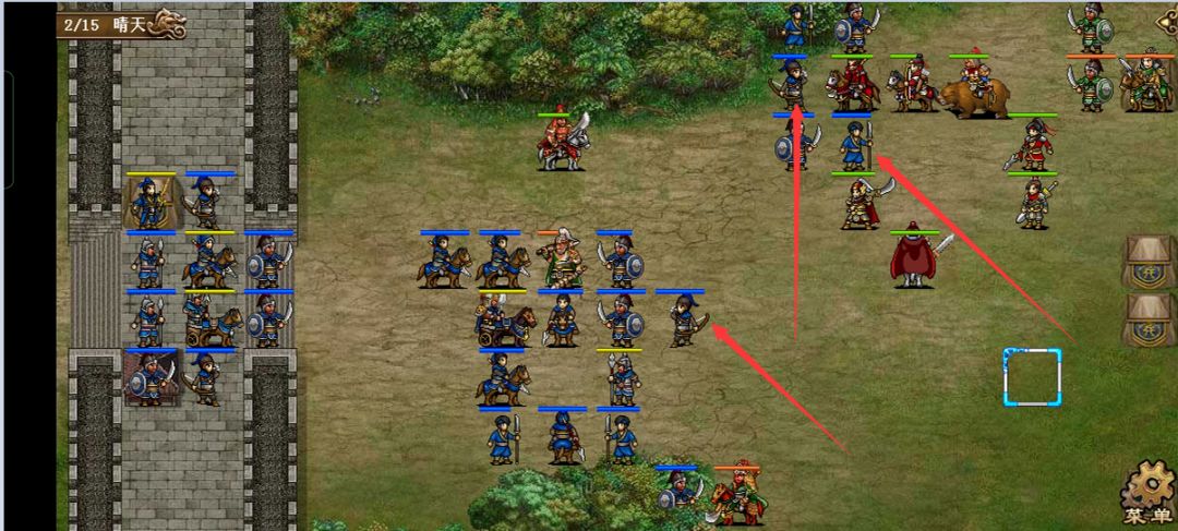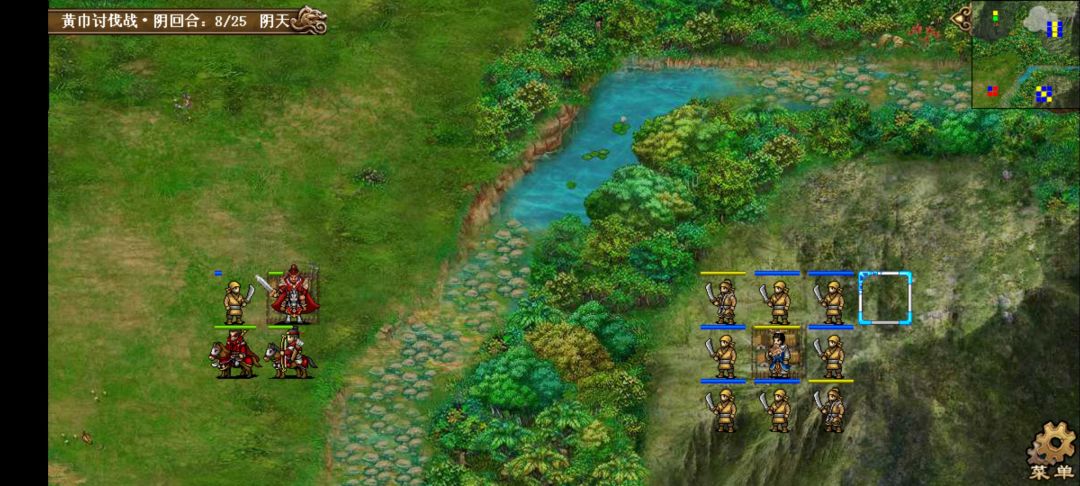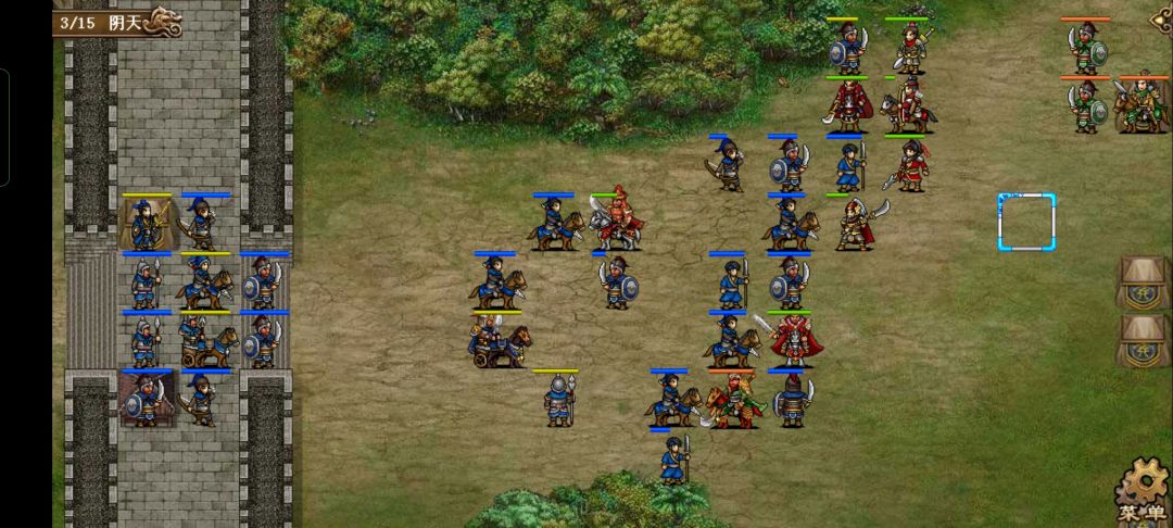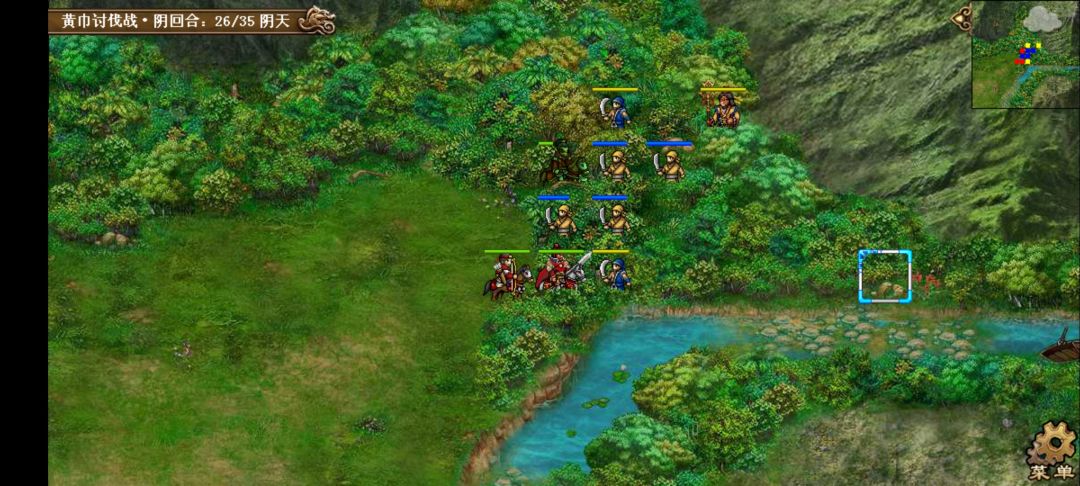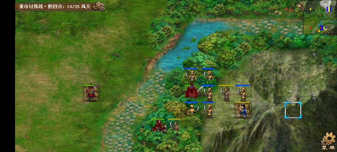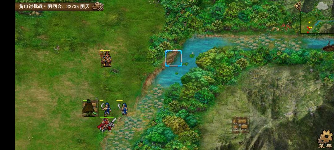 第三回合:由于我这个存档的问题,黄盖发生了一个格挡,导致郭汜没有攻击曹仁,这是巨大的失误,不过这里由于已经有5个经验果容错,所以不选择重新sl,下路弓箭手的位置可以吸引关羽到如下位置,为关羽与华雄的大战埋下伏笔