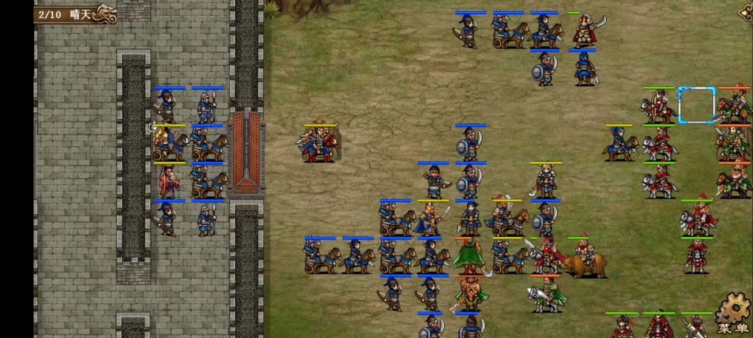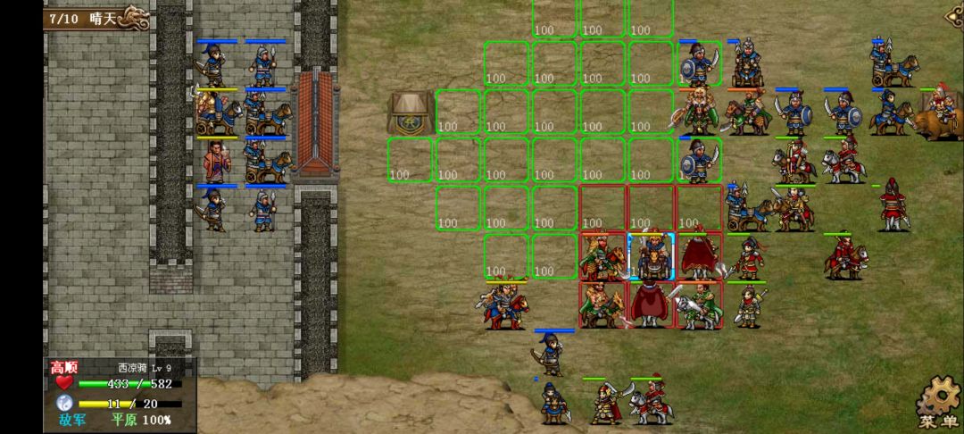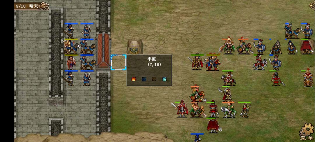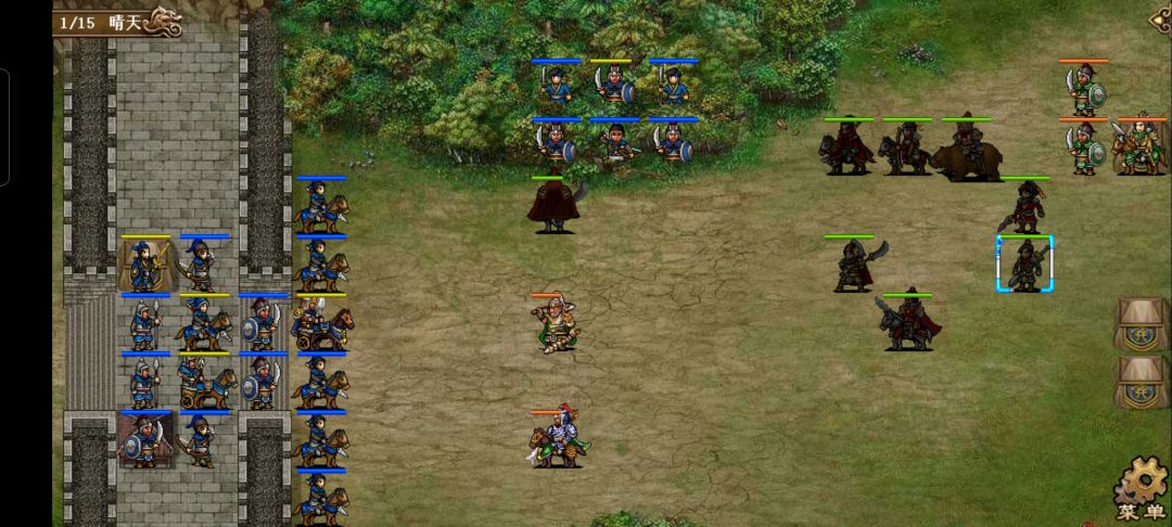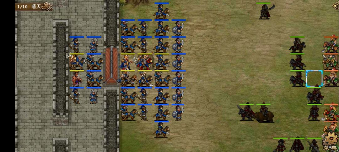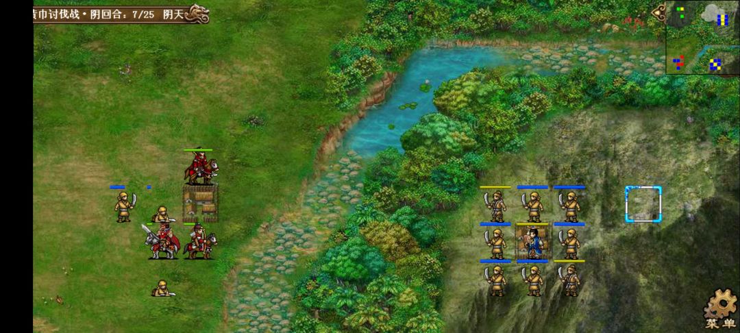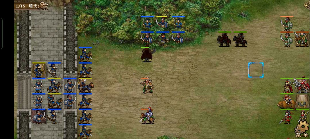 第一回合站位如上,曹仁铜袖吃反击,夏侯渊吸引张济(他是二转兵种,移动力+1,也因此而葬命),曹操吸引杨奉和樊稠高顺