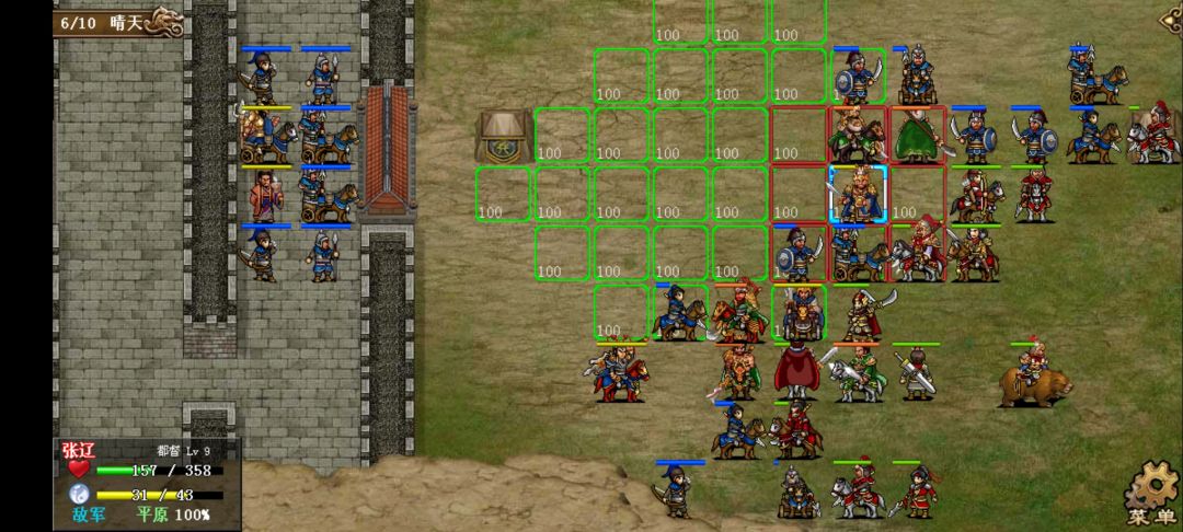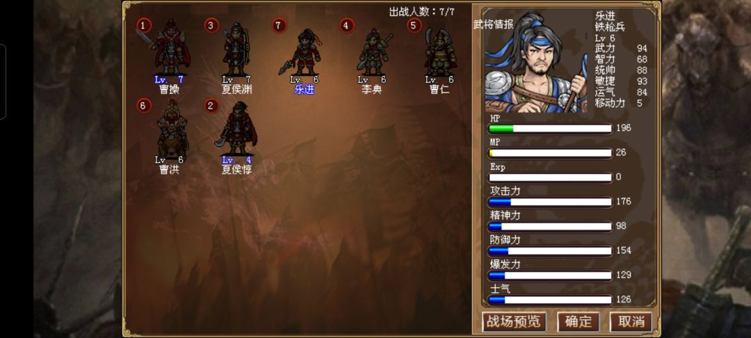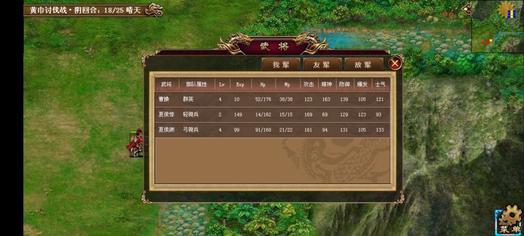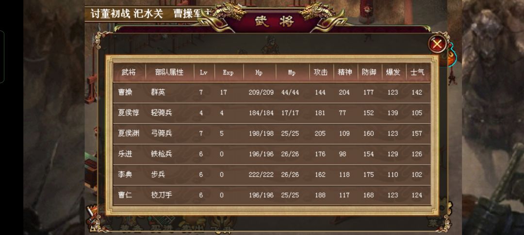 由于多了5个剧情所得的经验果,所以调整了一下等级,第一关打出654后,吃3个经验果进入774,收6级队友,汜水关之战吃一个经验果,使领头羊改为:曹操9级,曹仁9级,夏侯渊9级,
