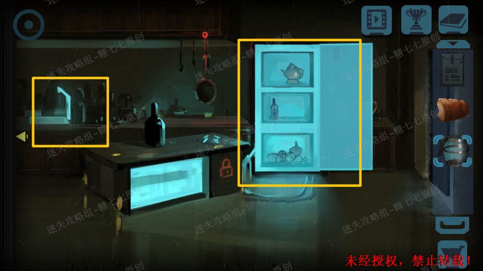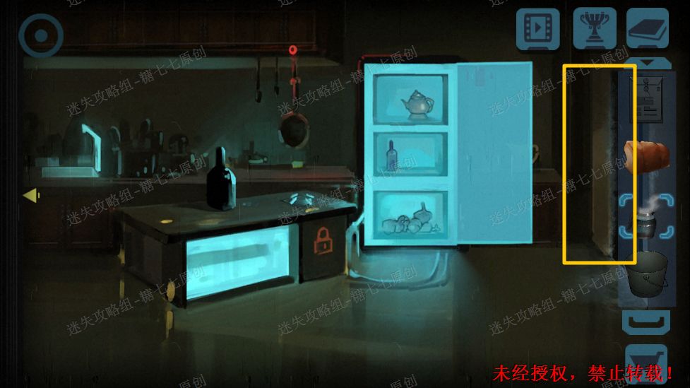 25.然后发现右边的门打开了,去右边的房间,拿走冰箱里的面包,还有水池旁的空水壶。25