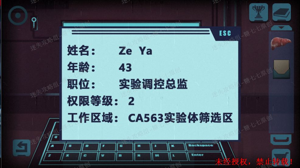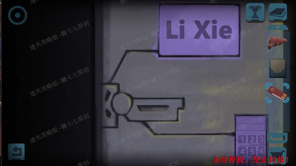 64.回到右边房间,根据刚才看到的Za的全名的得知密码。(两行密码分别为姓与名的首写字母在数字九宫格,按书写顺序写下的。)在柜子输入:123 5789,153 558拿到船舱权限卡。65.去到下一层,把卡放入机器。打开舱门,进去。65