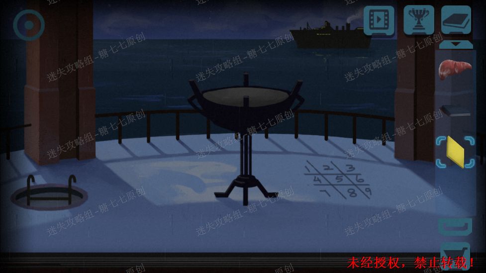 39.进入楼顶,然后捡起大锅里的星星。40.然后去二楼,根据大锅旁边的九宫格,得出柜子密码2649.(上面的框框表示数字在的九宫格的位置,如图所示,红色框出来的是2)取走望远镜和开锁器40/401