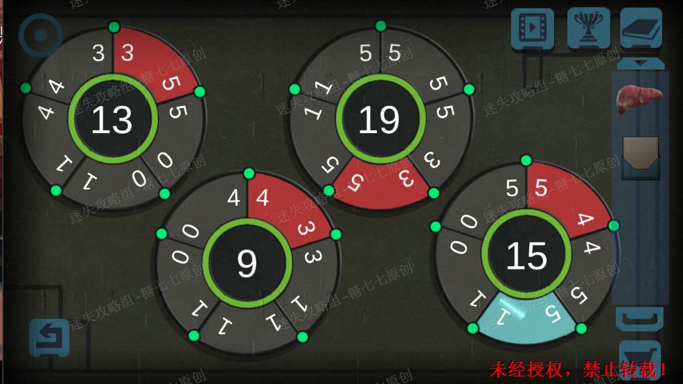 51.把圆盘放到右边门上,然后把小块块都放在正确的位置,(首尾相接并且所有数字相加等于中间的数字)如图所示。51
