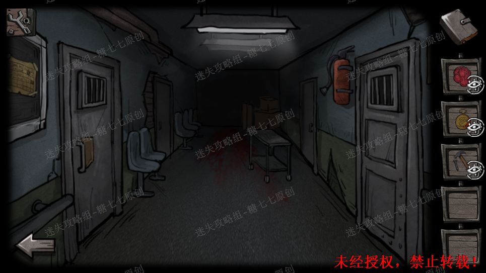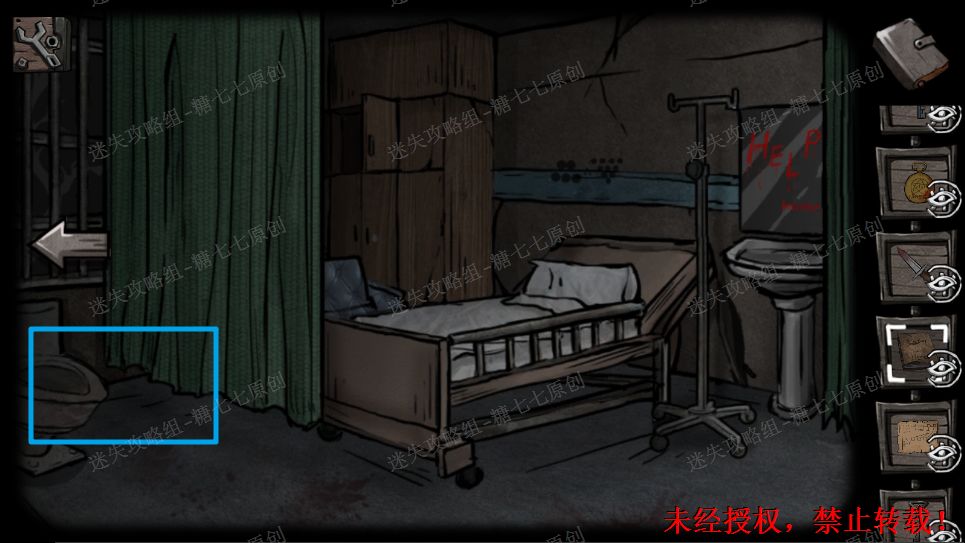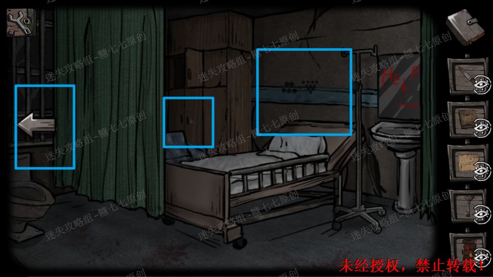 36、用病房钥匙进入右边病房,进去之后发现门被锁住了。捡起病床上的教堂钥匙,电路说明表,日记盒。36
