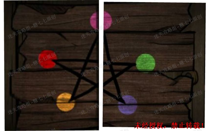 40、这里为了方便理解,我把两块木板拼到了一起。点开柜子上的箱子,从红色的按钮开始点,画一个五角星。有些人画五角星的顺序不太一样,这里给出颜色顺序:红绿黄粉紫40