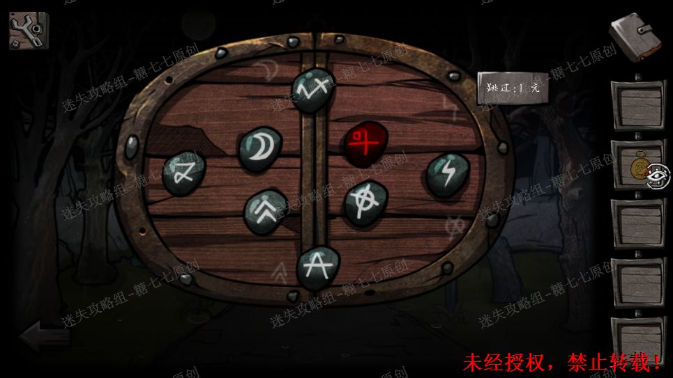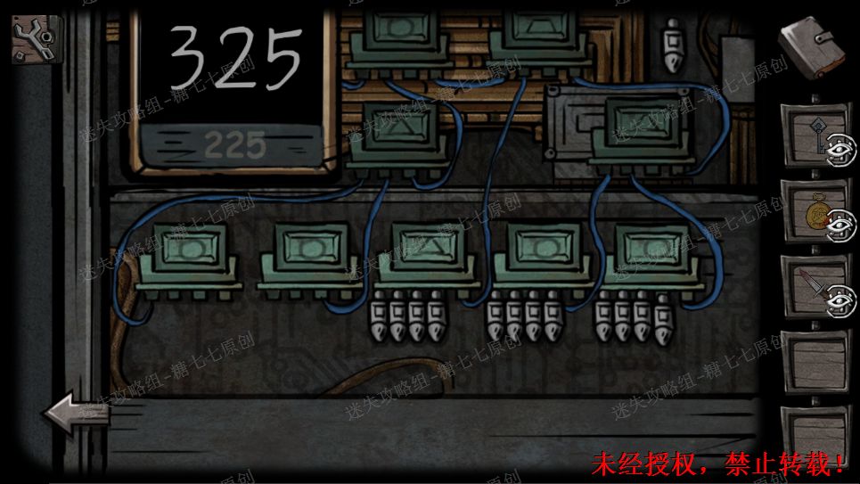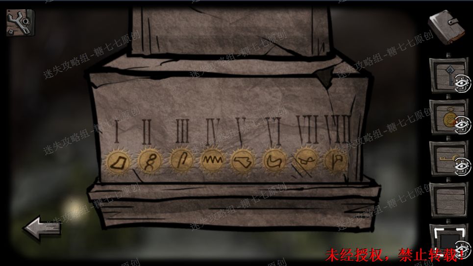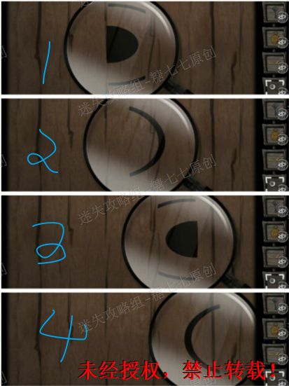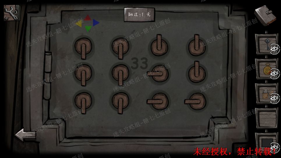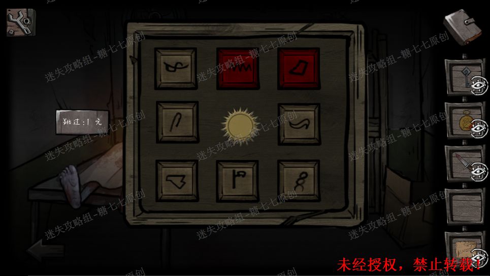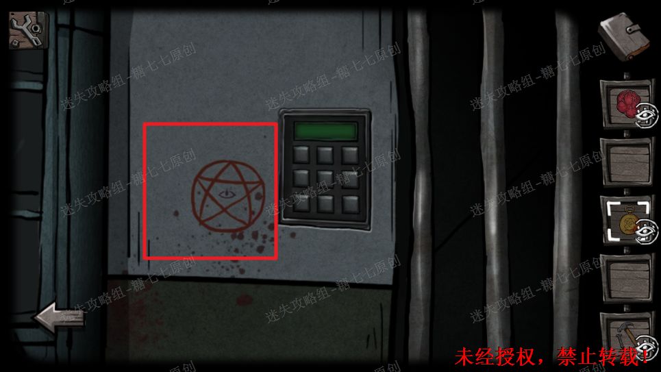 22、门上的符号略微眼熟,回到十字路走往前走,大铁门上给出的是外面四个的符号,而里面的符号就在密码锁上,按照对应的位置调整好(图示是调整好的)。22/221