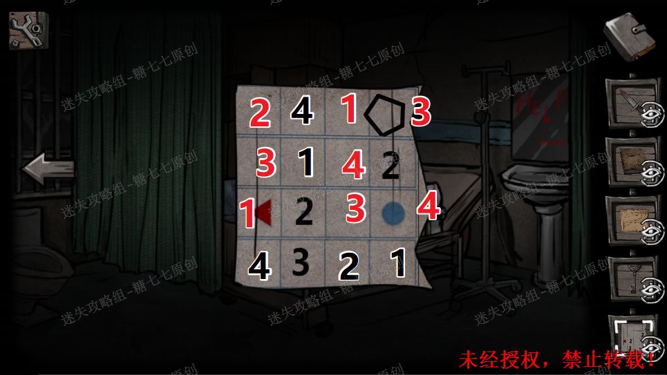 48、去教堂,输入密码,拿到脚铐钥匙。然后根据路标的形状和方向得到诊所药柜的密码为:上右左上下左48/481/482/483