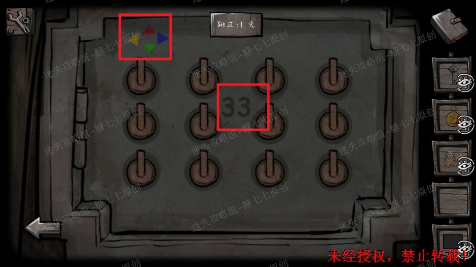 26、用打火机点燃蜡烛,灯按着红黄蓝绿的顺序亮起,也就是1234。再结合操作板上面33和不同颜色的三角得出,上代表1,左代表2,右代表3,下代表4,然后所有按钮相加为33。(答案如图)26/261