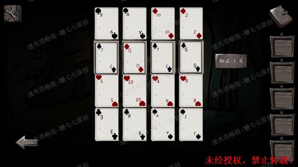 2、点击右边的门卫室,和里面的人玩牌。根据其他固定的牌,可以找到规律,第一列是从上到下依次递减2,所以第一列数字为“7”;第二列由上到下依次递减2,所以第二列数字为“Q”即“12”;第三列是从上到下递减3,所以第三排数字为“7”;第四排是从上到下递增3,所以第四排的数字为“5”。(还要注意花色哦,从左到右依次为方块、方块、梅花、梅花)2
