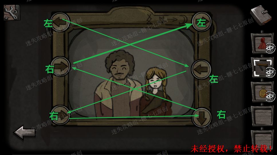 7、墙上有一个GUO跟女孩的合照,相框周围有箭头,那么这些箭头都指向哪里呢。我们可以看到桌子上有一本日历,我们走到外观察路牌可以发现绿色为右,红色为左。把日历从一月翻到最后可以发现,月份颜色为红红绿绿绿红即为左左右右右左。然后按照日历上面图案的顺序依次把箭头按照左左右右右左的顺序排好。然后把斗篷给女孩,换取心脏。7/71/72/73