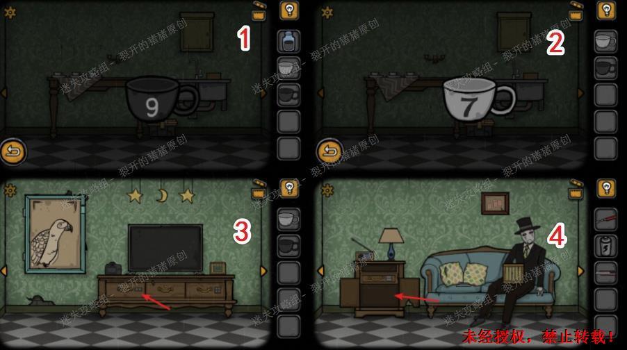 12.来到洗手池处,把牛奶倒进黑杯子获得数字9,把墨水倒入白杯子获得数字7获得密码79,打开电视机左下角柜子拿到钥匙,打开收音机下方的柜子,拿到刀片。12-1.2.3.4