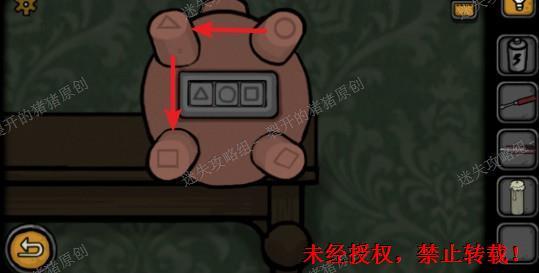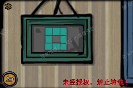 14.观察小丑上方的相框,我们看出了线索,找到小猪输入圆圈三角和方块拿到一个盒子,在水池下方的工具箱里拿到,螺丝刀和电池,用螺丝刀打开盒子拿到一个内存卡,(原因是小丑相册中有一根柱子是脱离三根柱子的,剔除掉后右腿就能推出门密码)14-1.2