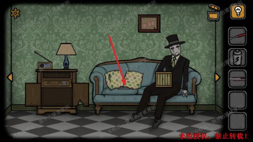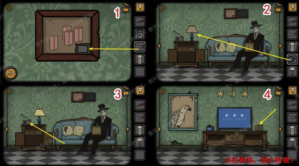 16.观察完图案之后我们去到有沙发的房间,用小刀划开上方的画,输入之前看到的罐子密码,拿到手电筒和台灯的按钮,把电池和手电筒组合,把台灯按钮和台灯组合,点击灯罩顶部拿到密码923,输入收音机之后获得一段波段,去到电视机处,右边的盒子输入波段拿到留声机的插头。16-1.2.3.4
