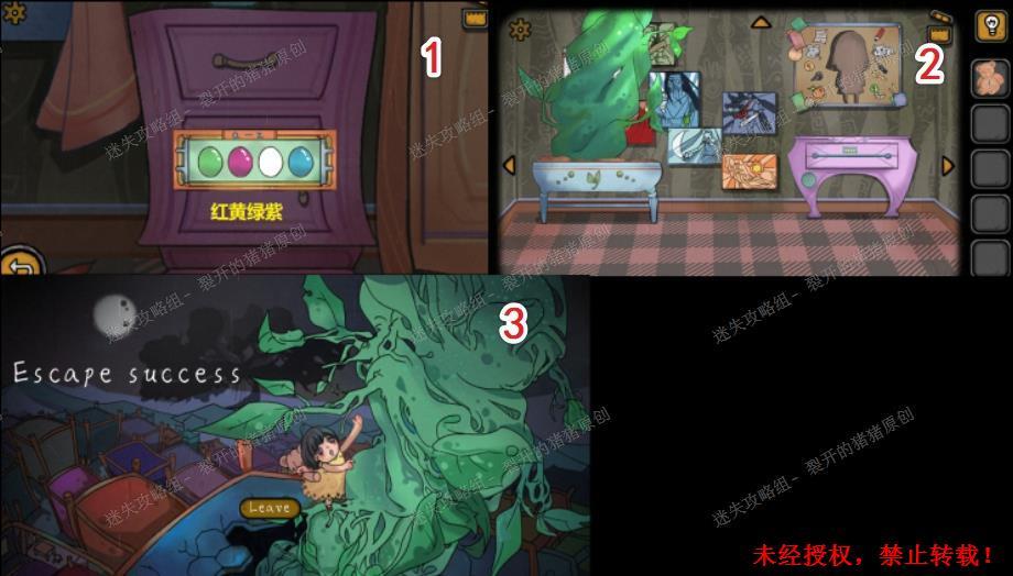 27.我们有了四张图纸之后,四张图片代表四个颜色,根据他们的首字母顺序得出密码,打开窗户右边的粉色柜子,密码为红黄绿紫,拿到一把钥匙,钥匙打开红色盒子,拿到一个种子,把种子放到花盆里,长出大树我们逃出了房间,完结散花。27-1.2.3