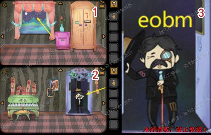 21.第三关的画风突然发生变化,色调突然“猛男”起来了,我们先点击窗户再点击鸟,获得鸟之后,给到在钢琴场景右边柜子里的魔术师,获得一个盒子(要把小鸟放在他头上),然后我们留意魔术师的衣服上字母从上到下(b需要脱帽)为eobm对应盒子上的颜色数字为5126,打开获得针。21-1.2.3