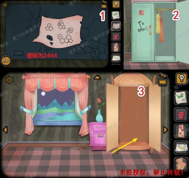 26.向上看到天花板,拿出图纸,解开天花板的密码为2444,完成后可以去衣柜那里拿走小熊布偶,同时我们看到衣柜上的字母,我们根据字母顺序推出密码35624(m13 o15 p16 v22 n14-1去掉十位数),打开有窗户房间右边柜子,拿到葡萄图案。26-1.2.3