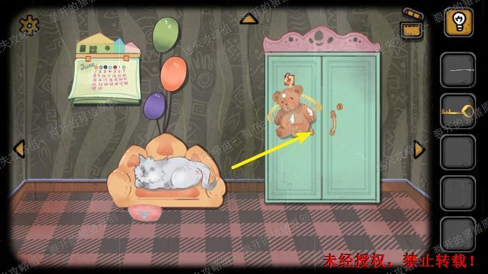 22.到一个全是壁画的房间,在左边的花盆里找到一把钥匙,来到猫咪的房间,用钥匙打开衣柜拿到线和小棍子,针和线结合缝补衣柜上的小熊娃娃,拿到猫粮给猫咪吃,得到猫屎?22-1.2