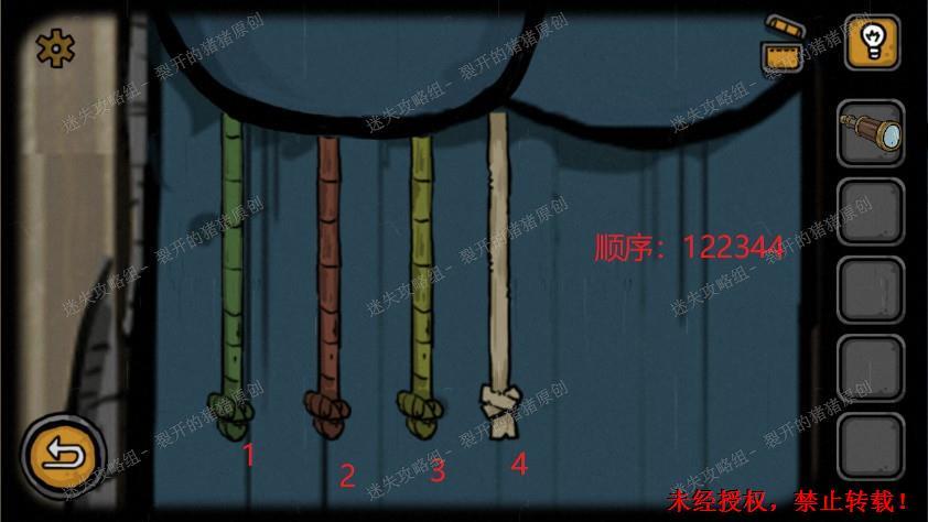 5.切换场景来到有窗帘的房间,把之前在木乃伊身上拿到的破布装在窗帘上,完成后按顺序拉动绳子,如图所示,绿、红、红、黄、白、白(该线索在一个场景的黄色相框中),打开窗帘后,我们看到树上有只鸟把它赶走,再使用望远镜看到四个尸体。5-1.2