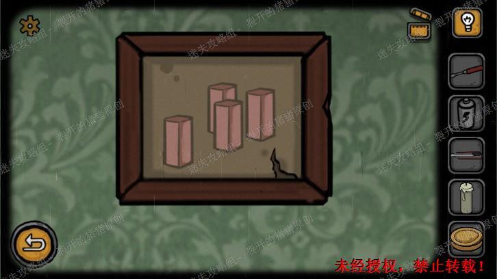 18.来到鹦鹉壁画处,我们用小刀割开两边获得两个线索,左边现实894,右边有许多竖杠代表了密码,用螺丝刀拧开右边框上的螺丝,按按钮就可以看到背后有一个密码箱,根据之前右边的线条转动,(实线和虚线要逆时针点,点线要顺时针),打开之后获得红蜡烛和一张房间图,把三个蜡烛放到烛台上获得数字3+4-5=2,之后来到收音机处把894打入获得一个波段图(有bug可能不显示),用手电筒照亮小丑手里的盒子,输入波形图,看到数字5。18-1.2.3