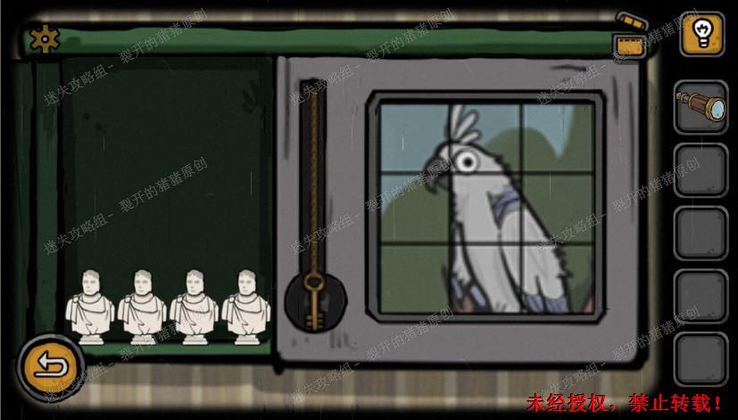 6.回到房间,根据刚刚看到的线索排列右上角的石雕像和右边的鹦鹉拼图,完成后拿走中间的钥匙。6-1.2