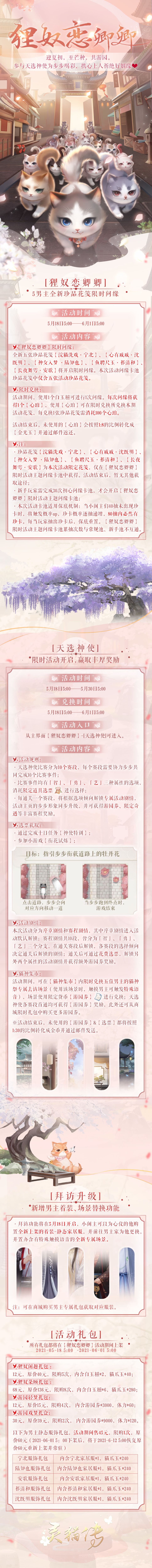 5月18日全新版本来临,「狸奴恋卿卿」限时问缘、“天选神使” 限时活动、新功能“出游”等内容和活动同步开启。