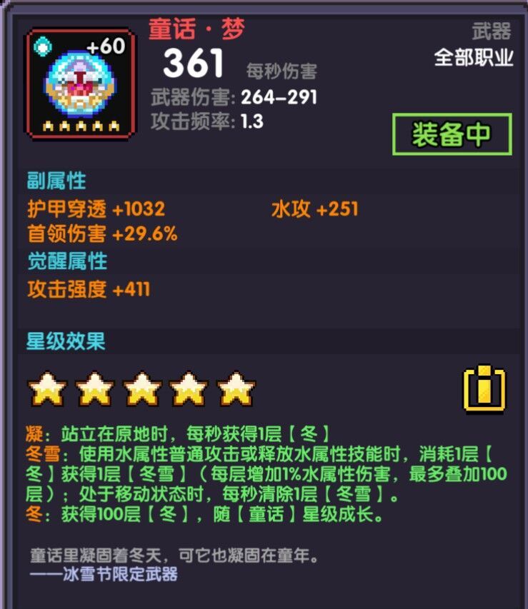 属性如上,值得一提的是,在之前的版本中,童话的面板加成就比鬼爪高。但因为该装备与当时最强的鞋子宝石鞋相性极差,一个要动一个又不能动,抛弃了宝石鞋后就选择了童话。